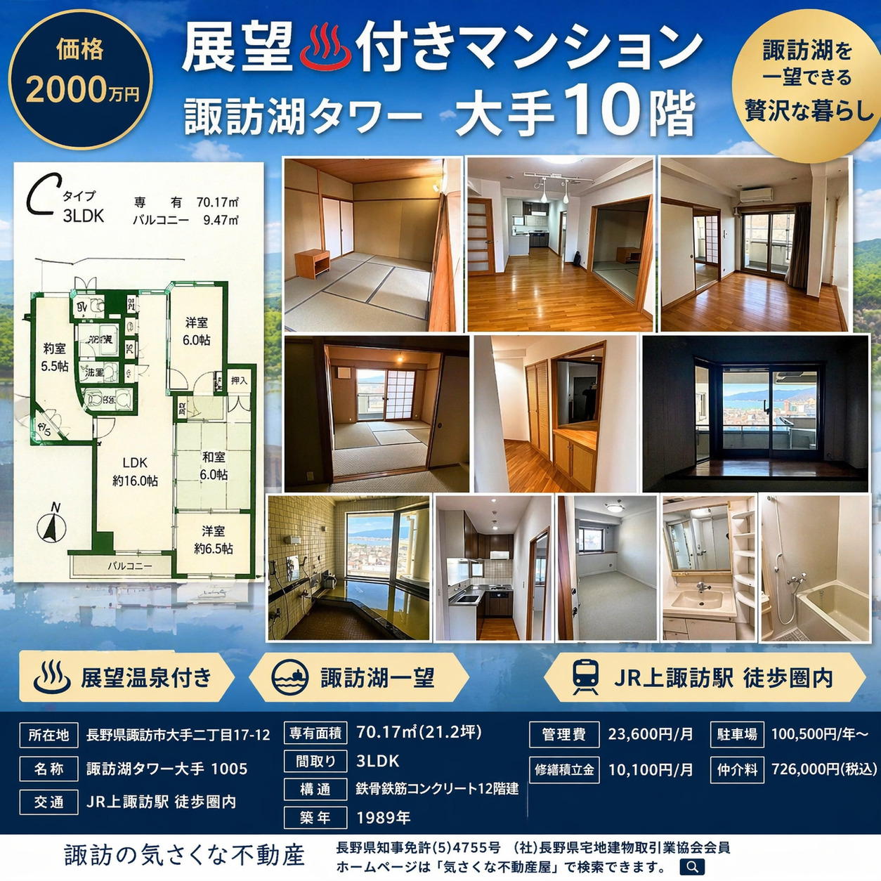 タワーリゾートマンション大手 展望温泉風呂付き9階角部屋花火見えますよ!駅近く 売却済み3LDK 諏訪市大手2丁目